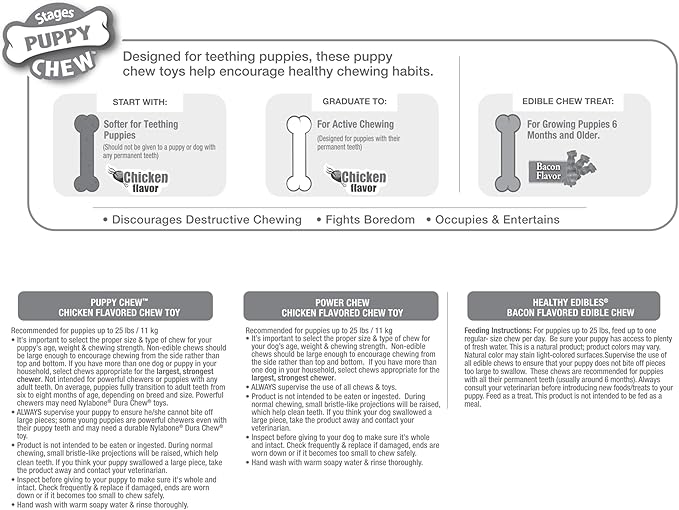 Nylabone Teething Puppy Chew Starter Kit, Two Puppy Chew Toys and Puppy Chew Treat, Puppy Supplies, Chicken & Bacon Flavor, Small/Regular (3 Count)