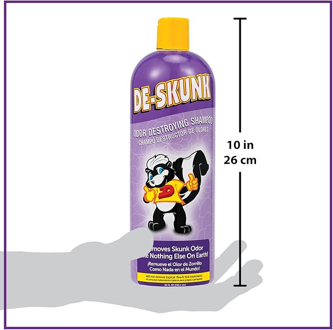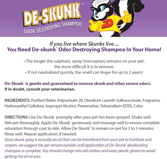 - EASY TO USE – Use De-Skunk Shampoo promptly after your pet was sprayed. Apply from tail to head, gently massage deep into coat and skin and allow De-Skunk to stay on pet for 3 - 5 minutes. Rinse well and repeat at least once or until odor is eliminated