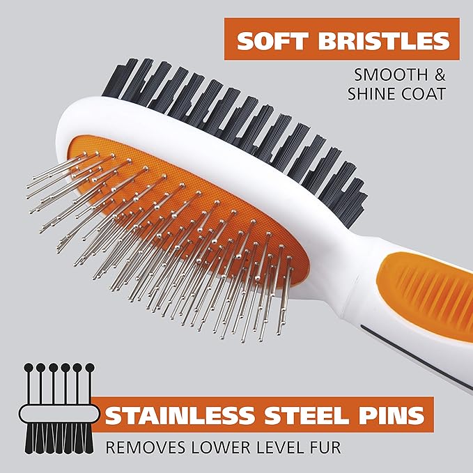 - Double Sided Design – Soft bristles are used to smooth and shine the coat while the stainless-steel pins are used to remove deep lower level fur that normal bristles miss