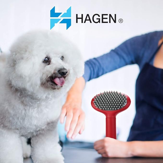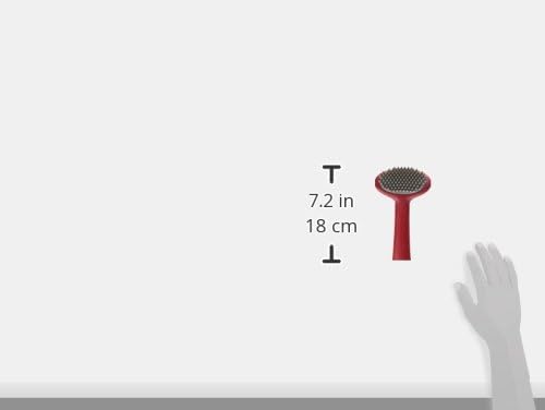 - Dog grooming brush made with gray rubber bristles, gray pad and red handle