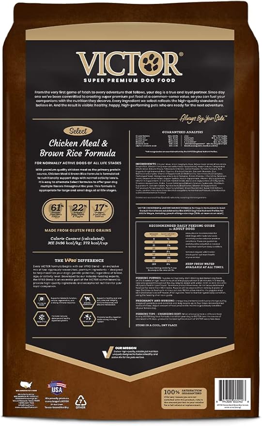 - CHICKEN MEAL & BROWN RICE: VICTOR Chicken Meal & Brown Rice Formula super premium dog food is formulated for normally active dogs and is ideal for dogs with allergies to other meat proteins