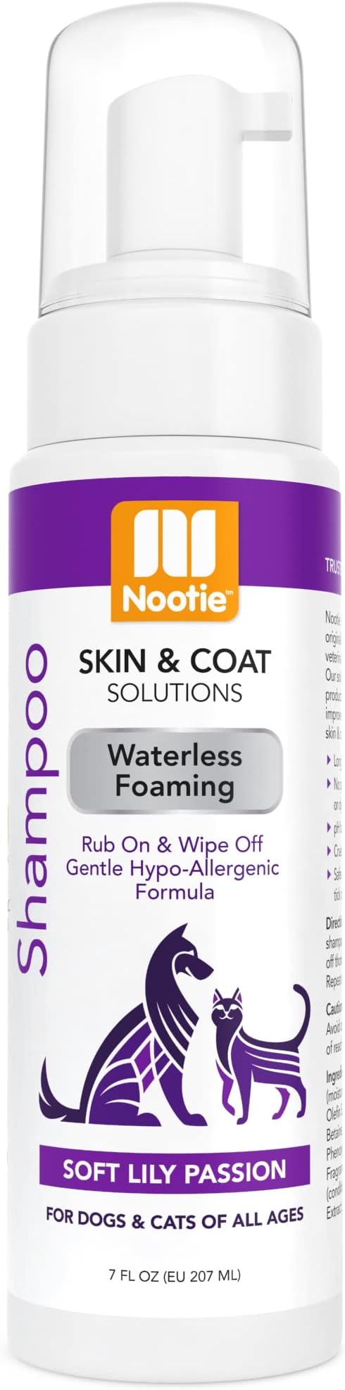 - Nootie's Waterless Foaming Shampoo lightly scented with Soft Lily Passion takes the stress out of bathing! Now it's easy to freshen up your pet's coat without the water-splashing mess just rub on and wipe off