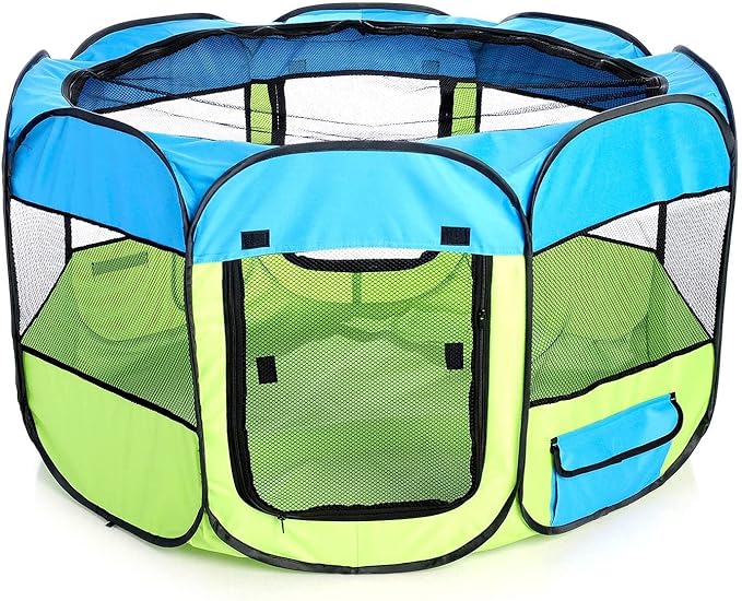 - The Lightweight, Portable and Easy to store Dog Play Pen also features a Built-in Side Pouch that's perfect for placement of Treats or Belongings with an additional Mesh Pouch