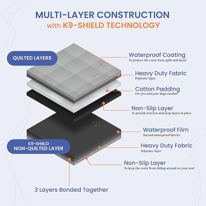 - K9-Shield Waterproof, Non-slip Layer - Special non-quilted waterproof laminate layer makes the seat bottom completely waterproof while the non-slip backing keeps the cover from moving around (seams are not watertight). K9-Shield is a special textile laminate developed by 4Knines to provide maximum protection for your vehicle.