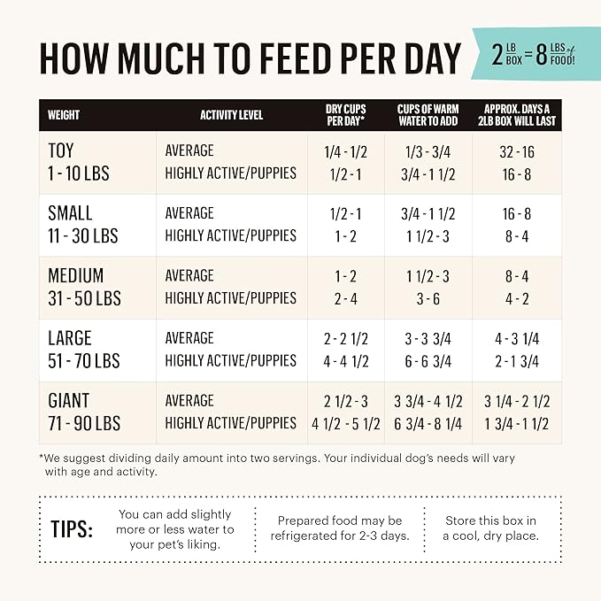 - MAKES 8 LBS OF FOOD: Just add warm water for a wholesome & delicious meal that rehydrates to 4x its weight. A 2 LB box makes 8 LBs of fresh food! Serve alone as a complete easy homemade meal, or use as a topper to dry food.