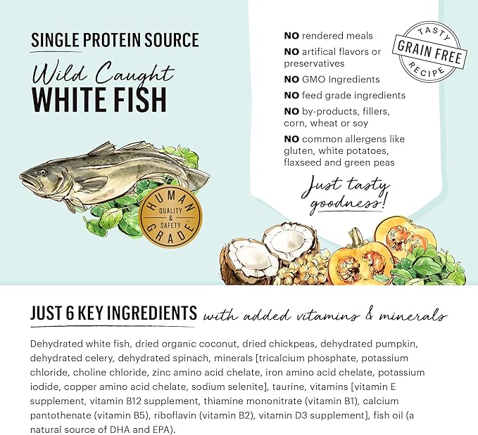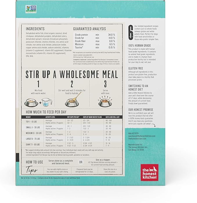 - LIMITED INGREDIENT & GRAIN FREE, WILD CAUGHT FISH: With just six whole food ingredients, The Honest Kitchen Limited Ingredient Fish dog food is made especially for dogs with food sensitivities or allergies.