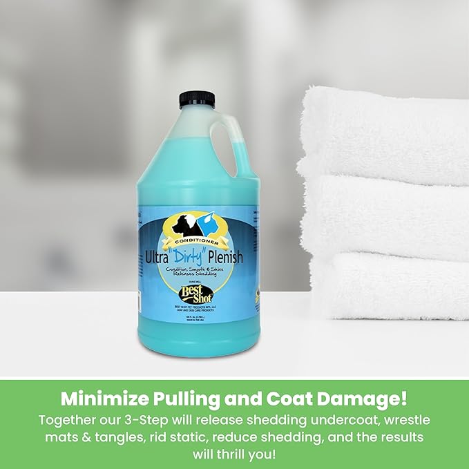 - Ideal Pet Grooming Product: This pet grooming product is available in a 1-gallon bottle. To wrestle tangles, mats, and static, use this conditioner as Step 2 in conjunction with any Best Shot shampoo (Step 1) and Ultra Vitalizing Mist (Step 3).