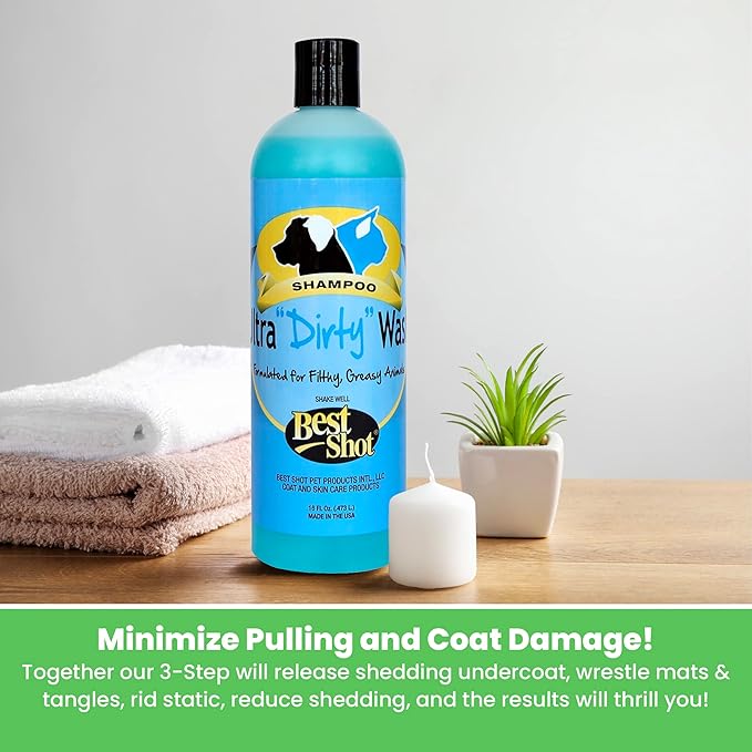 - Ultra Dirty Wash Shampoo: Best Shot’s Ultra Dirty Wash is a professional-strength pet shampoo specifically crafted for deep cleaning and deodorizing your pet’s coat. Formulated with a pH-balanced formula, this shampoo will not damage your pet’s skin