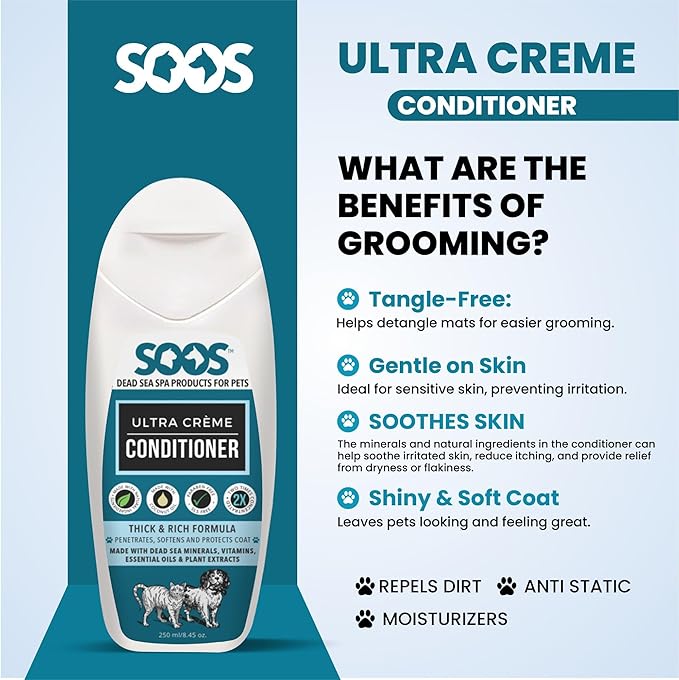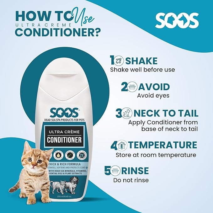 - PET'S CLEAN AND HEALTHY HAIR: Would you like to help your pet have a clean and healthy Skin and Coat? Soos (Ultra Crème) Conditioner helps to care and maintain the health of your pets’ skin and coat. This natural treatment uses its amazing formula to help boost your cat or dog's appearance and shine whilst helping to reduce dirt, redness, and irritation. This dog conditioner make hair smooth and shine