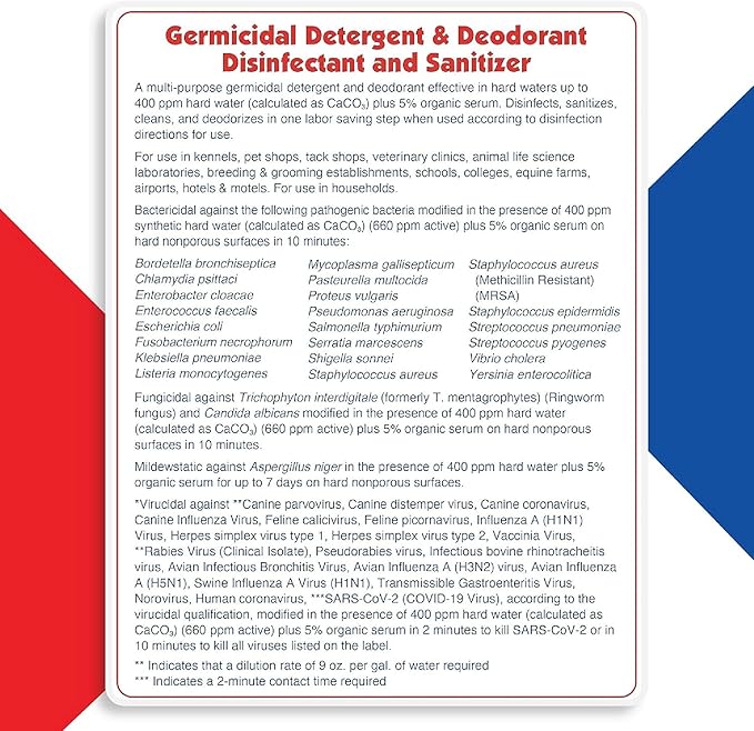 - VET APPROVED AND EPA REGISTERED - Protect your pets from a broad spectrum of pathogens including kennel cough, staph infection, E.Coli and Canine Parvovirus with our EPA-registered and vet-formulated disinfectant cleaner.