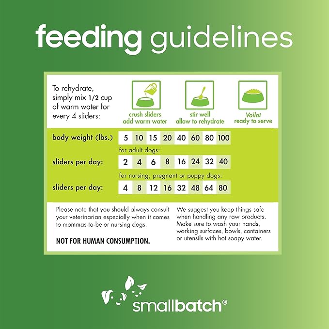 - What’s in the Bag? – Each bag of our 14oz freeze-dried chicken dog food has about 50 sliders. All meats are responsibly sourced and harvested. Our produce is organic. The foundation of our business is in the sourcing. We only partner with locally procured ranchers and farmers that maintain transparent food policies and that are committed to providing leadership in sustainability and land stewardship. It’s how we’ve served our customers for the 15+ years in business.