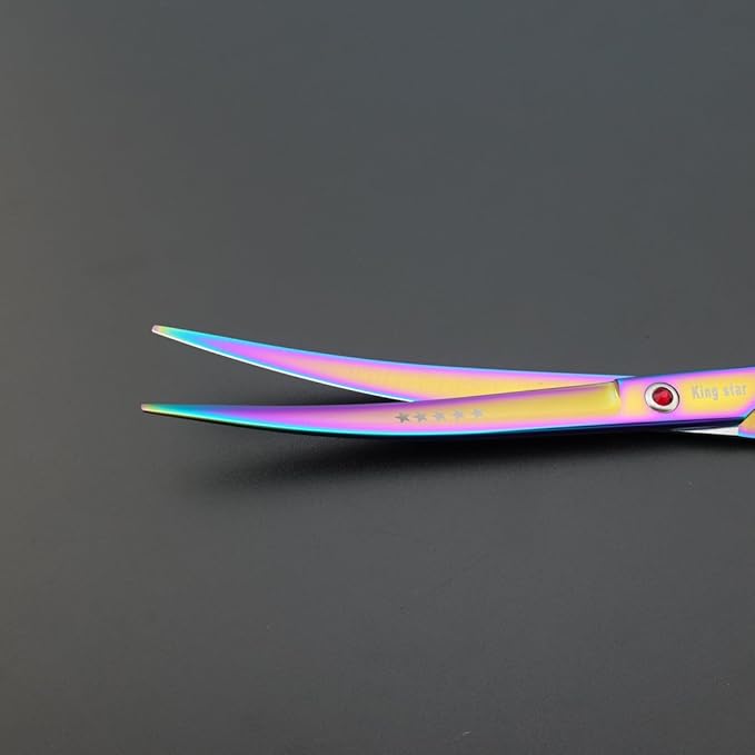 - SHARP EDGE. The edge line of the blade is evenly polished,which make the scissors durably sharp.With meticulously crafted clear tip of tooth ,the thinning scissors are sharp and do not clip the hair.The edge of the curved scissors is 25°-30°,majority standard angle to satisfy most part of groomers.