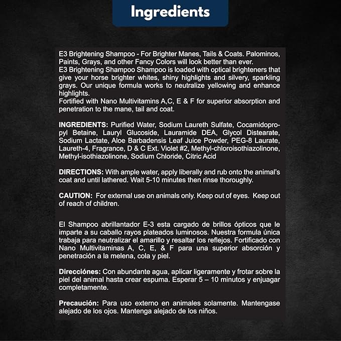 E3 Brightening Shampoo for Horses 32oz - Enhances Coat Color, Deep Cleansing, Moisturizes & Conditions, Gentle Formula, Vet Approved