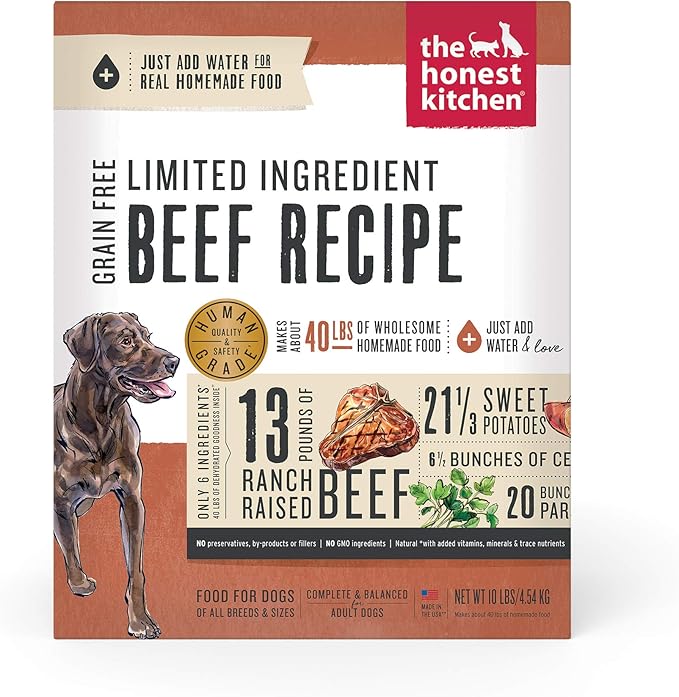 - LIMITED INGREDIENT & GRAIN FREE, RANCH RAISED BEEF: With just six whole food ingredients, The Honest Kitchen Limited Ingredient Beef dog food is made especially for dogs with food sensitivities or allergies.