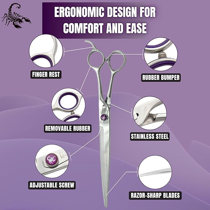 - BEST SELLING SHEARS: These Kenchii Scorpion dog grooming shears are our top selling grooming shears! Our extra durable grooming scissors are made with premium Japanese alloy steel with a semi-convex, micro serrated edge designed to reduce slippage and enhance cutting performance