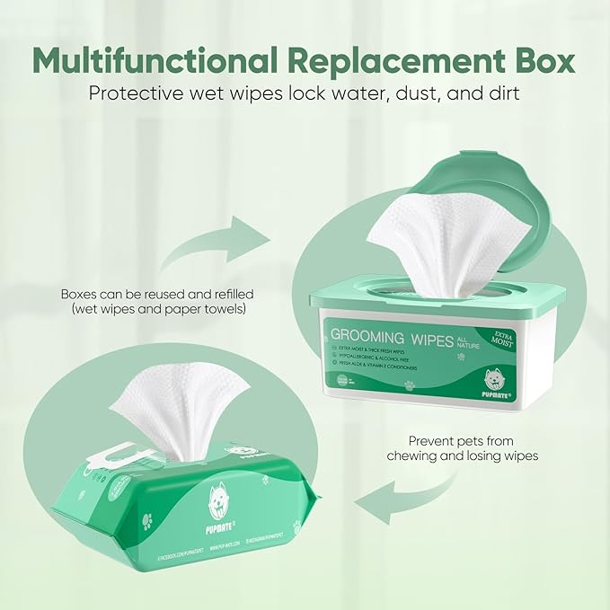 - CONVENIENT STORAGE AND DISTINCTIVE BOX DESIGN: The PUPMATE experience is about convenience, and our pet wipes exemplify this principle. Encased in a moisture-sealed box that shields them from dust and light, they're primed for use at a moment's notice. Be it your adventures outdoors or cozy moments at home, our dog wet wipes take on the role of unwavering protectors, an indispensable resource for your pet's joy