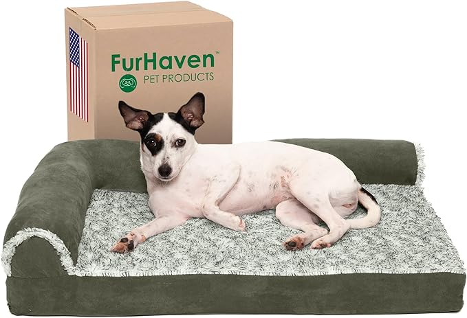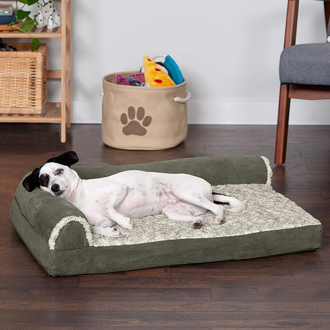 Furhaven Memory Foam Dog Bed for Medium/Small Dogs w/ Removable Bolsters & Washable Cover, For Dogs Up to 35 lbs - Two-Tone Plush Faux Fur & Suede L Shaped Chaise - Dark Sage, Medium