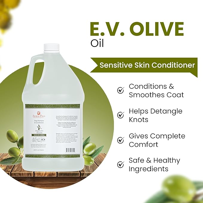 - Dog Shampoo for Sensitive Skin: Organic E.V. Olive Oil and Sweet Almond Oil to condition coat and relieve dryness. Coconut oil and cucumber extract to soothe the skin and relieve itching