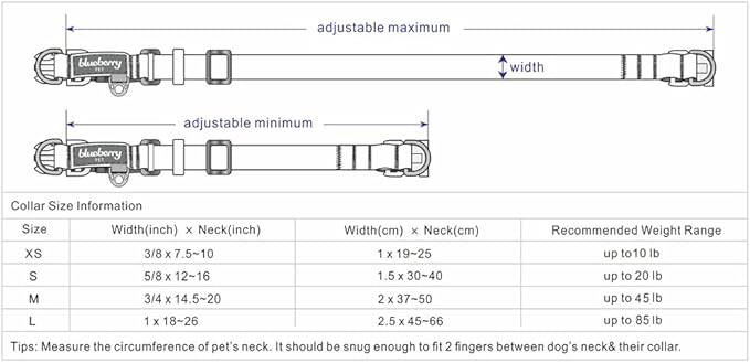 - Neck 14.5"-20", Width 3/4", Size Medium; The dog collar reflective does not stretch itself, please make sure leave ONLY 2 fingers between collar and dog neck. A properly fitting nylon dog collar and harness won't leave any room for your dog to chew