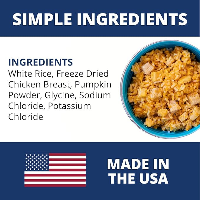 - OUR AWARD-WINNING BLAND DIET is freeze dried and contains white rice, and 100% human grade white meat chicken, raised cage free with NO antibiotics or hormones. Enhanced with a powerful electrolyte blend to boost hydration and energy.