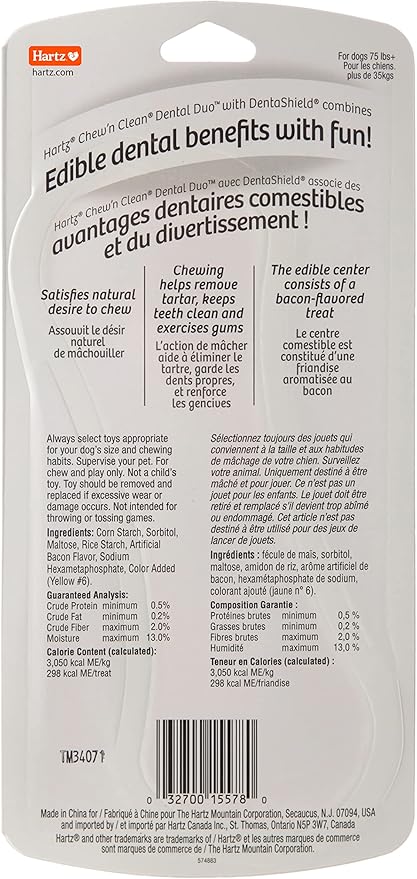 - CONTAINS: Contains one Hartz Chew ‘n Clean Dental Duo dog toy. Other sizes available are extra small through extra large and in a variety of colors. Toy color chosen at random during time of shipment.