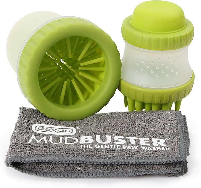 Dexas MudBuster Portable Pet Cleaning Kit with Dog Paw Washer, Pet Bathing Brush, Microfiber Towel, Small, Green