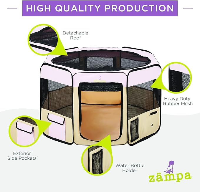 - What To Expect From Zampa: Playpen, mesh top to zip on when needed, 4 metal spikes for outdoor safety, carrying case, and a commitment from our customer service team. Please don't hesitate to contact our customer service and BARK, we will make it right.