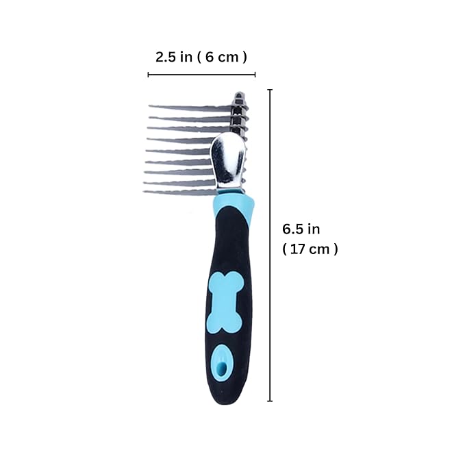 - Gentle On Pet’s Skin And Fur --- The stainless steel serrated and no-scratch teeth on our dog and cat comb are sharp enough to cut through thick mats yet gentle enough not to cause any discomfort. When used properly, the dematting comb breaks up dense tangles without pulling your pet’s fur.