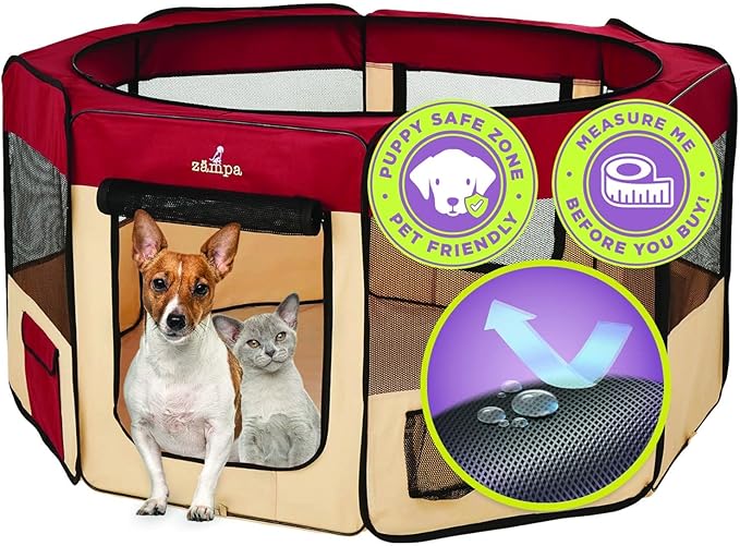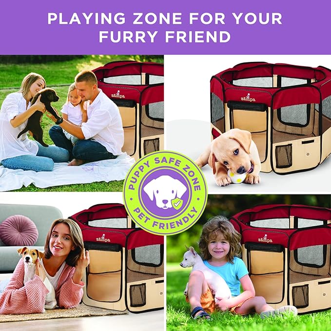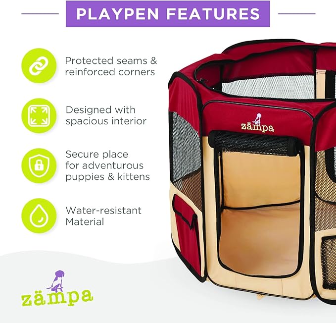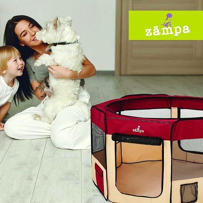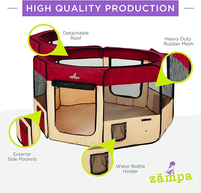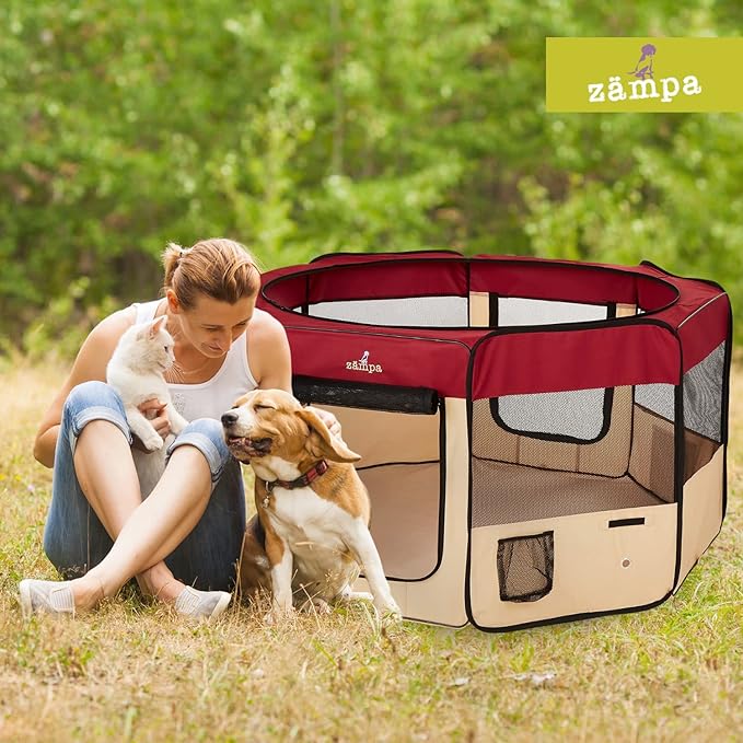 - What To Expect From Zampa: Playpen, mesh top to zip on when needed, 4 metal spikes for outdoor safety, carrying case, and a commitment from our customer service team. Please don't hesitate to contact our customer service and BARK, we will make it right.