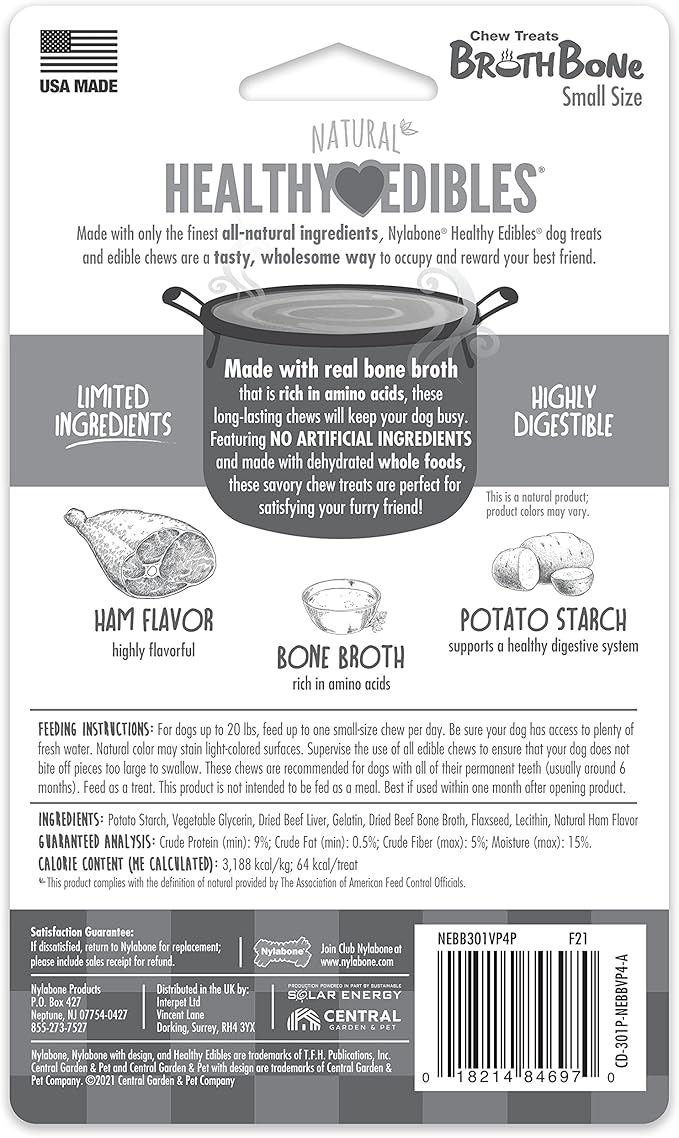 Nylabone Healthy Edibles Broth Bone Natural Dog Chews Long Lasting Treats Ham Flavor Small/Regular - Up to 25 Ibs. (4 Count)