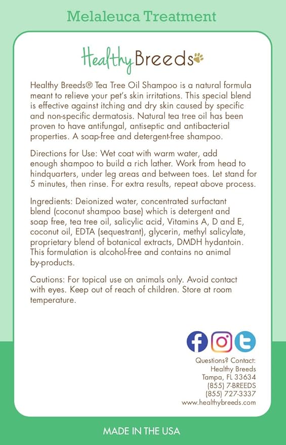 - Healthy Breeds Tea Tree Oil Shampoo is a free of soaps and detergents -- A natural formula meant to relieve your pet’s skin irritations