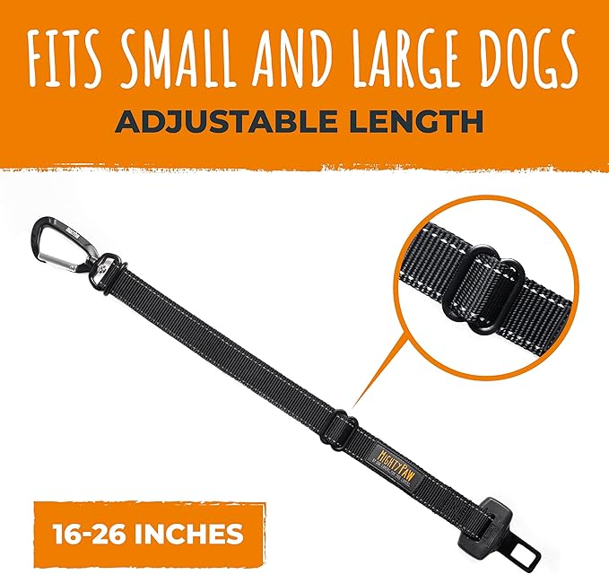 - ADJUSTABLE LENGTH FOR COMFORT: Our car dog harness seat belt is made of durable nylon and can be adjusted to fit your dog's size. Whether they want to stand, sit, or lay down, you can easily adjust the length from 16 to 26 inches for their comfort