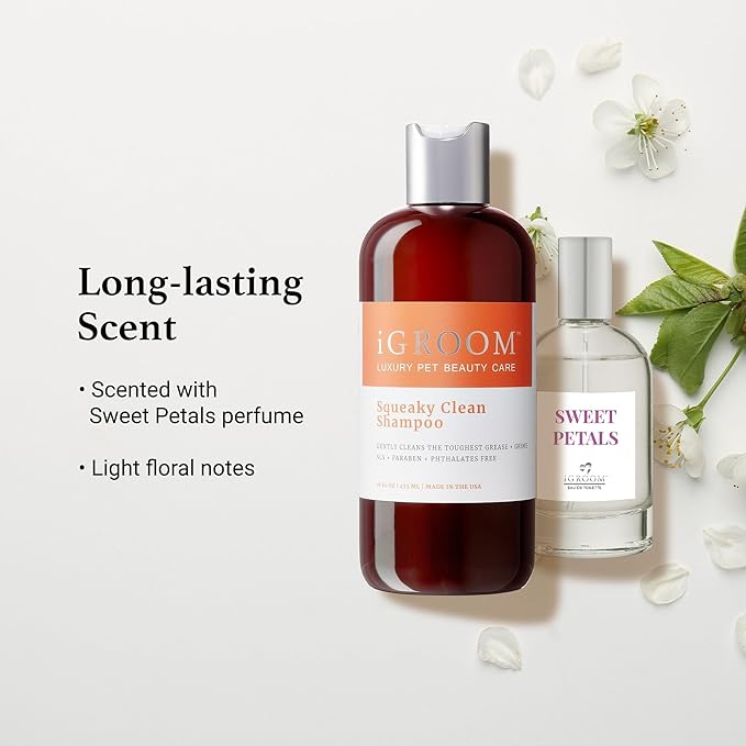 - DEEP CLEANING DOG SHAMPOO – a heavy-duty pet shampoo to gently break up the heaviest of greasy build-ups. Easily removes dirt, grease, and grime. Squeaky Clean rinses out effortlessly and leaves the coat soft, luxurious, and smelling beautiful. Ideal for all coat types. Scented with iGroom Sweet Petals perfume.
