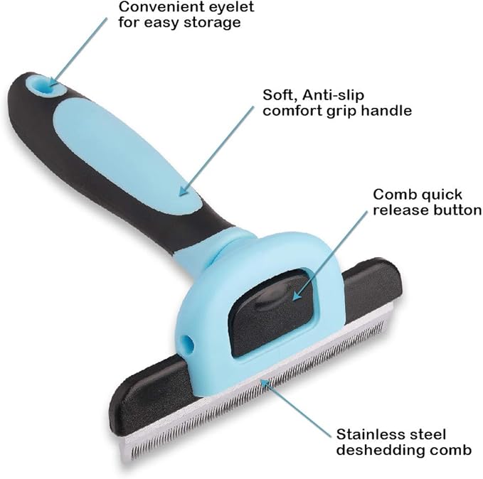 Pets First Professional Pet Brush - Grooming & Deshedding Tool for Cats & Dogs - Reduces Shedding, Dead Hair, Tangles - Detachable Stainless Steel Comb for Easy Cleaning - Soft Anti-Slip Handle,Blue