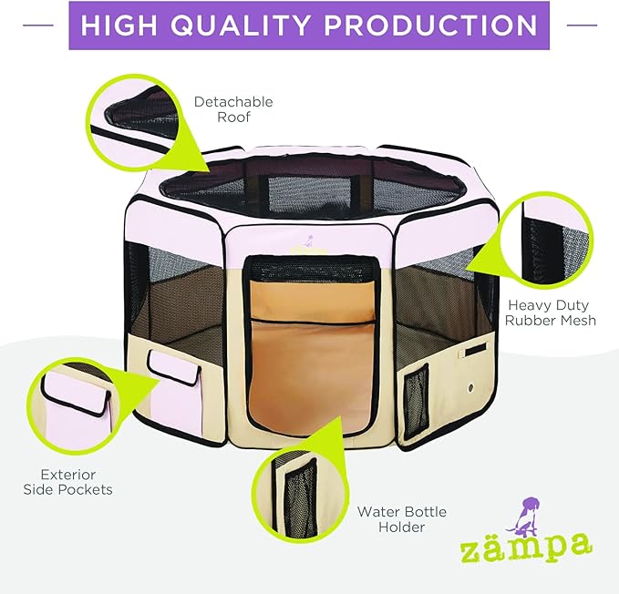 - What To Expect From Zampa: Playpen, mesh top to zip on when needed, 4 metal spikes for outdoor safety, carrying case, and a commitment from our customer service team. Please don't hesitate to contact our customer service and BARK, we will make it right.