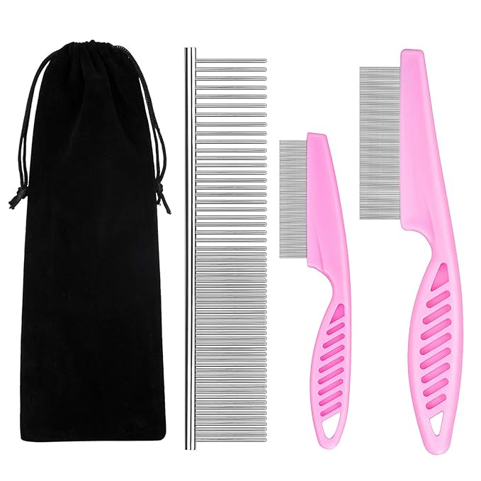 Flea Comb for Cats Dog Comb Lice Comb Metal Teeth Durable Tear Stain Dog Combs Remove Float Hair Combing Tangled Hair Dandruff Pet Comb Grooming Set 3 Pieces Add Storage Pouch (Pink)