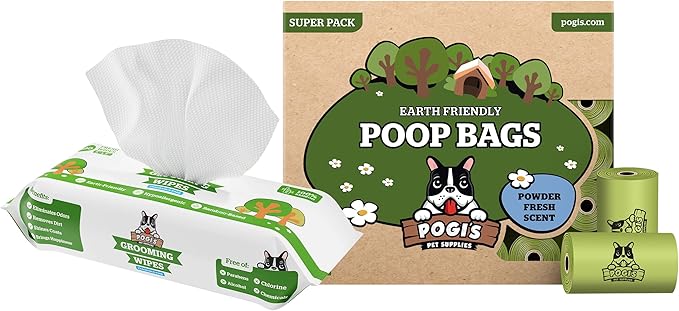 Pogi's Special Edition Poop n' Wipe Pack - 30 Powder Fresh Scented Rolls (450 Bags) and 1 resealable Pack of 100 Dog Grooming Fresh Wipes.