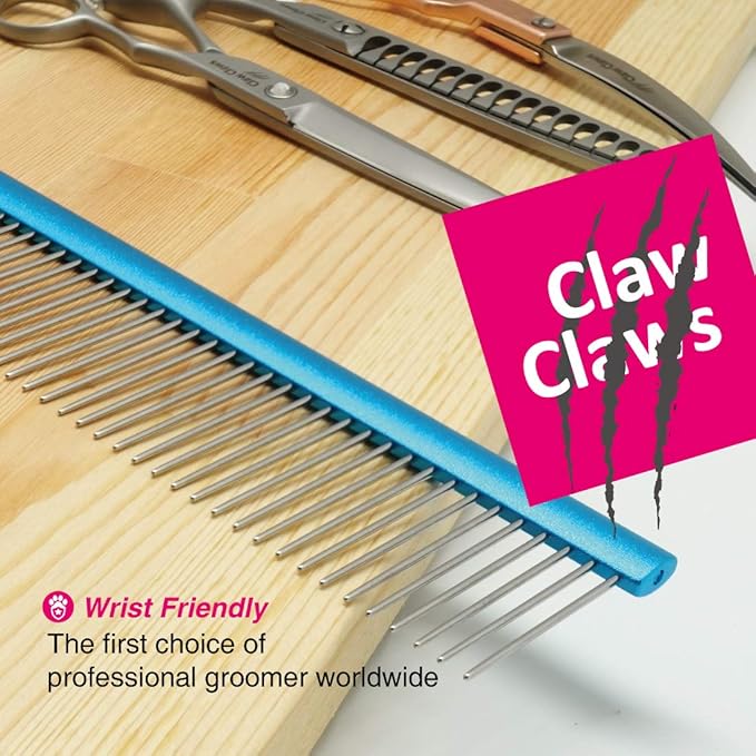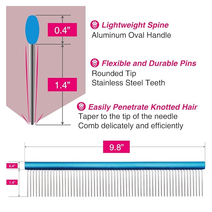 Greyhound Comb with Oval Handle for Dogs and Cats, Removing and Shedding Matted, Tangled Hair, Metal Comb with Stainless Steel Pins, Detangling Grooming Tool (9.8" Blue-20% fine pins)