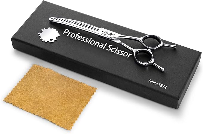 - ERGONOMIC & SAFE DESIGN - The curved chunker scissors with detachable finger inserts and finger rests are mainly designed for right handed groomer and it can occasionally be used by left hand. Blunt tips can protect skin well. High resilience muffler can reduce noise effectively. Curved blades are convenient to grooming the sensitive areas such as face, ears, paws, nose, limb, and so on.