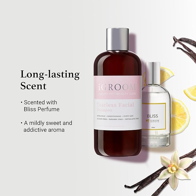 - TEARLESS DOG SHAMPOO – perfect for puppies and dirty dog faces. iGroom’s Tearless Facial Shampoo is an ultra-mild, hypoallergenic shampoo, which will not irritate the eyes. Perfect for that first-ever bath, sensitive pups, and shampooing dogs with hair over their eyes. Lightly scented with iGroom Bliss perfume.