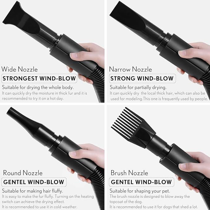 - 1 x Brush Nozzle, which makes gentle wind-blow, it is recommended to brush, groom and shape your pets