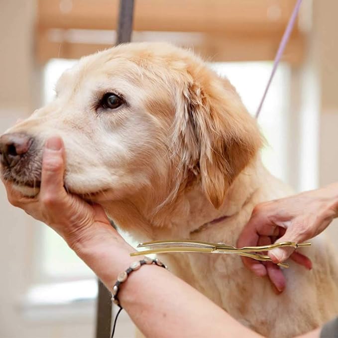 - MULTIFUNCTIONAL - 7 inches scissor with 3.5 inches cutting blades, the yellow dog thinning shear is ideal for pet hospital, pet salon, and family to use on dogs, cats and so on. You can become a professional beautician at home do pet grooming, saving time and money. Add the dog grooming shear to your Amazon Cart and it will exceed your expectation to create pretty and sophisticated pet hair style. It is also definitely the perfect gift for relatives and friends, especially for dog or cat lovers.