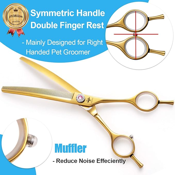 - ERGONOMIC & SAFE DESIGN - The curved thinning scissors with detachable finger inserts and finger rests are mainly designed for right handed groomer and it can occasionally be used by left hand. Blunt tips to protect your lovely pet’ s skin from being injured. High resilience muffler can reduce the friction between the handles to avoid making a loud noise. Curved blades are convenient to grooming the sensitive areas such as face, ears, paws, nose, limb, and so on.