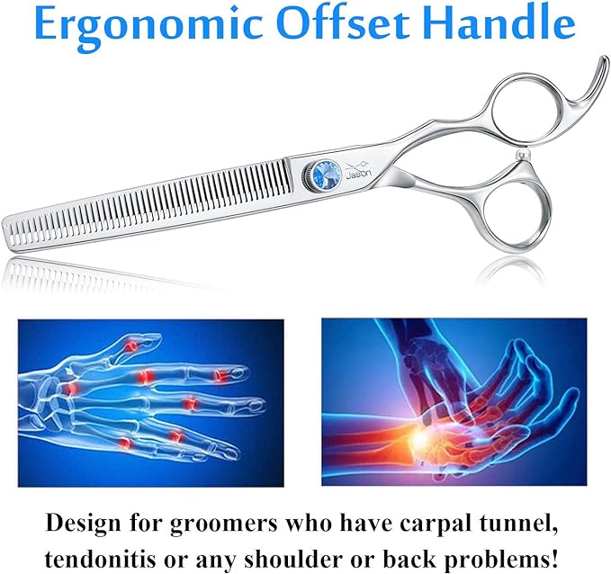 JASON 7" 50 Teeth Thinning Dog Grooming Blending Scissor, Ergonomic Pet Grooming Thinner Blender Shears Cat Trimming Texturizing Kit with Offset Handle and a Jewelled Screw, 30% Thinning Rate