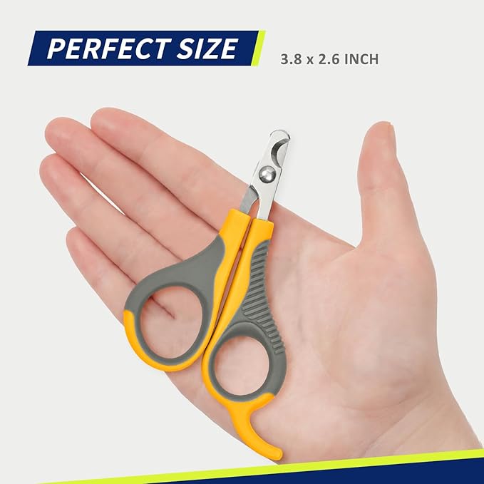 - [Color & Size]: Grey/Yellow, Length 3.8" x Width 2.6" Inch. Flat scissors, unlike curved ones, the flat tip used for most occasions. Suitable for various small animals, including but not limited to cats, puppies, kittens, rabbits, birds, parrots, rats, chickens, hamsters, ferrets, lizards, guinea pigs, not fit for medium and large dogs.