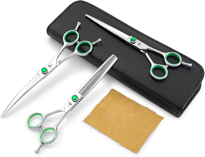 - MULTIFUNCTIONAL - The dog shears set includes cutting shears, curved cutting scissor and chunker shear. 7 inch scissors with 3.2 inch cutting blades, the kit are ideal for pet hospital, pet salon, and family to use on dogs, cats and so on. You can become a professional beautician at home do pet grooming, saving time and money. The straight ones can trim extensive body fur efficiently, the curved one is suitable to grooming the sensitive areas such as face, ears, paws, nose, limbs and so on.