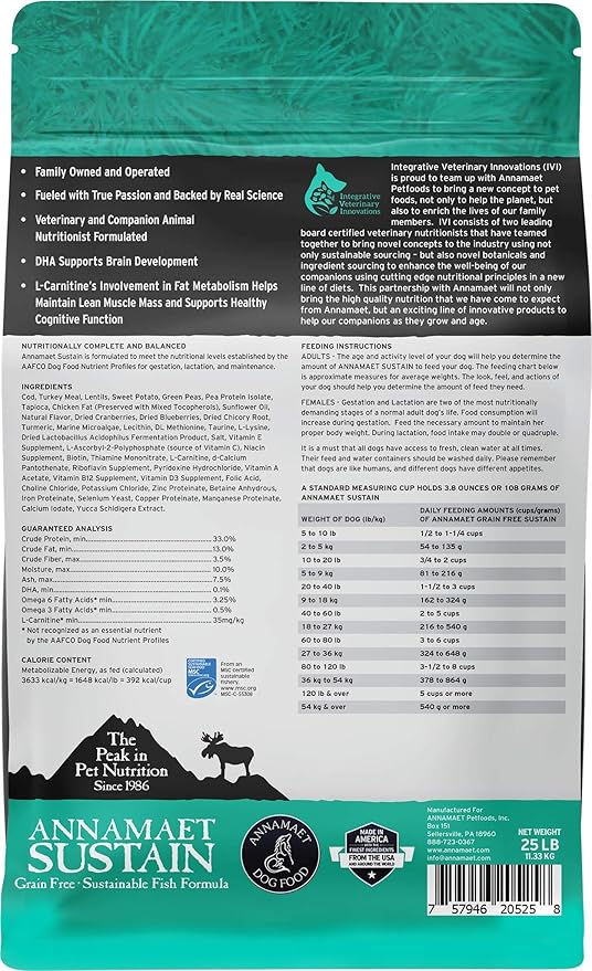 Annamaet Grain-Free Sustain Formula Dry Dog Food, (Line-Caught Cod & Free-Range Turkey), 25-lb Bag