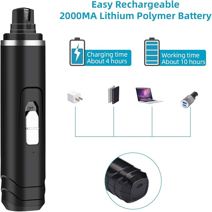 - 【Cordless & Rechargeable】 The compact cordless cat nail grinder have a built-in 2000mAh battery that only need be full charged 4h to support 10 h working time,saving time and convenient to charge via laptop, or power bank ect.. It’s essential to find an effective and comfortable dog nail trimmer that works well for your best furry friends!