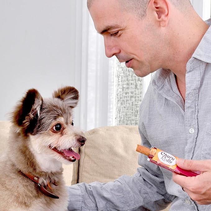 INABA Churu Rolls for Dogs, Grain-Free, Soft/Chewy Baked Chicken Wrapped Churu Filled Dog Treats, 0.42 Ounces Each Stick| 48 Stick Treats Total (8 Sticks per Pack), Chicken with Salmon Recipe