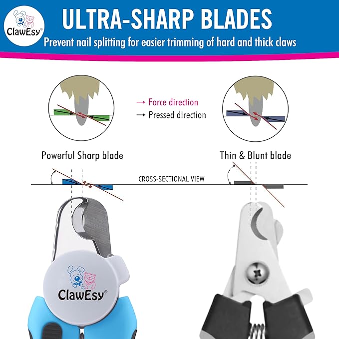 - SMART SAFETY GUARD & ADJUSTABLE LOCK MECHANISM: Equipped with a safety guard, these clippers prevent over-cutting, ensuring your pet’s nails stay healthy and pain-free. Easily adjust the guard to accommodate different nail sizes and shapes. Plus, the user-friendly lock mechanism secures the blades while not in use, keeping them safe for storage.